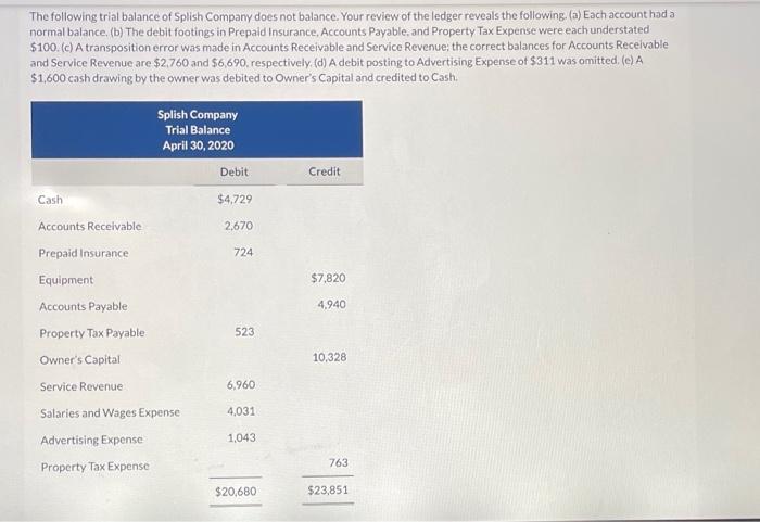 Solved The Following Trial Balance Of Splish Company Does Chegg Com